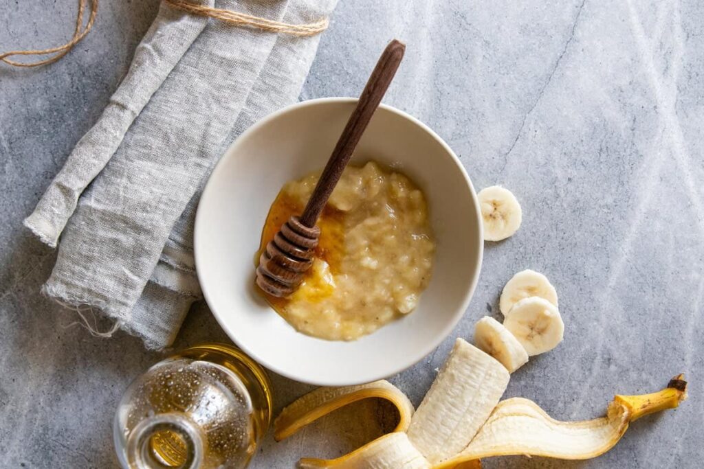 Chuối là nguồn cung cấp vitamin và khoáng chất tự nhiên hỗ trợ nuôi dưỡng tóc chắc khỏe. Trong khi đó, mật ong đóng vai trò như chất giữ ẩm, mang lại độ mềm mượt và bóng sáng cho mái tóc. Thế nên, việc kết hợp một quả chuối chín xay nhuyễn cùng một thìa mật ong nguyên chất giúp tạo thành hỗn hợp sánh mịn, dễ thẩm thấu. Bạn nên massage nhẹ nhàng hỗn hợp này lên da đầu, trải đều dọc theo thân tóc; sau đó ủ trong khoảng 20 – 30 phút trước khi xả sạch với nước ấm và làm sạch tóc bằng dầu gội dịu nhẹ.