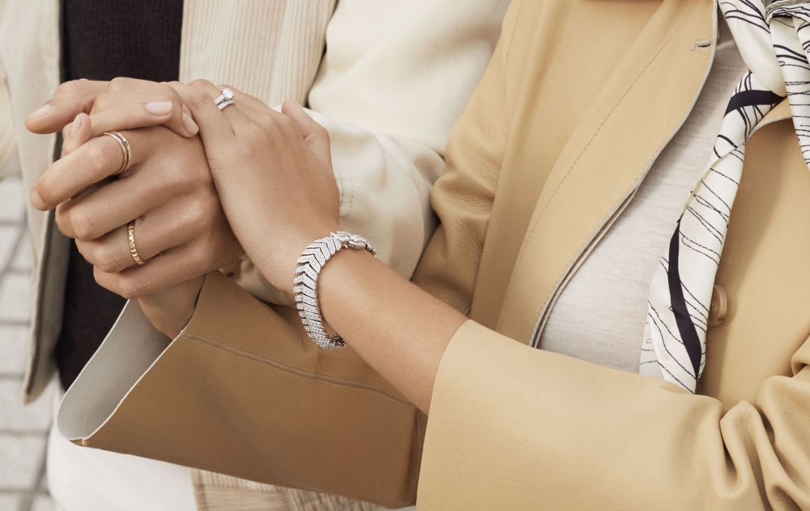 Chiếm trọn ánh nhìn khi chạm mắt là mẫu nhẫn cưới và nhẫn cầu hôn bằng bạch kim nạm kim cương. Hoàn hảo trên cổ tay nàng là mẫu lắc đeo tay 3 vòng Jack de Boucheron bằng vàng trắng nạm kim cương sành điệu.