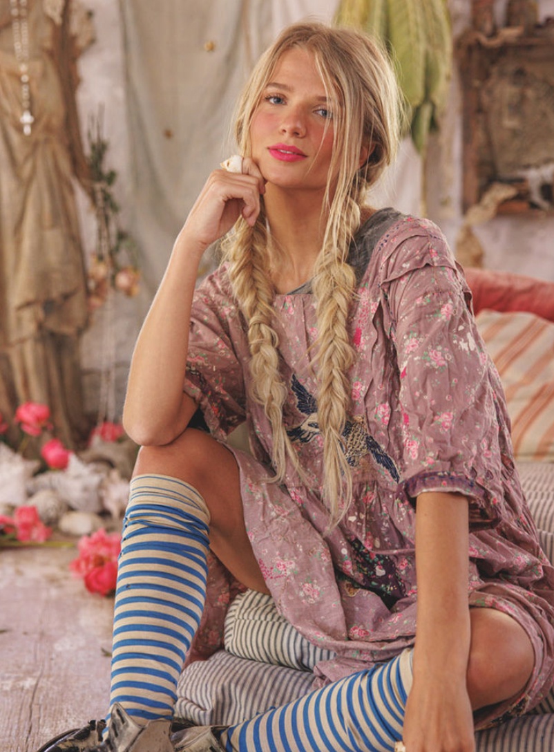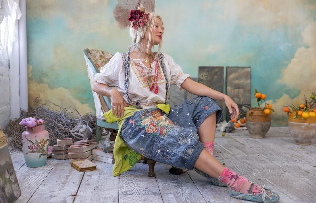 Magnolia Pearl ra đời không từ tinh thần của thời trang mùa vụ, mà từ ký ức vá víu, sửa chữa và sinh tồn. Người sáng lập Robin Brown học may từ rất sớm không phải để chạy theo xu hướng, mà để sửa lại những gì ít ỏi mình có. Xuất phát điểm đó tạo nên ngôn ngữ thẩm mỹ rất riêng của thương hiệu: những đường chỉ hiện rõ, bề mặt vải mang dấu vết của thời gian và vẻ đẹp không cố che giấu sự từng trải.